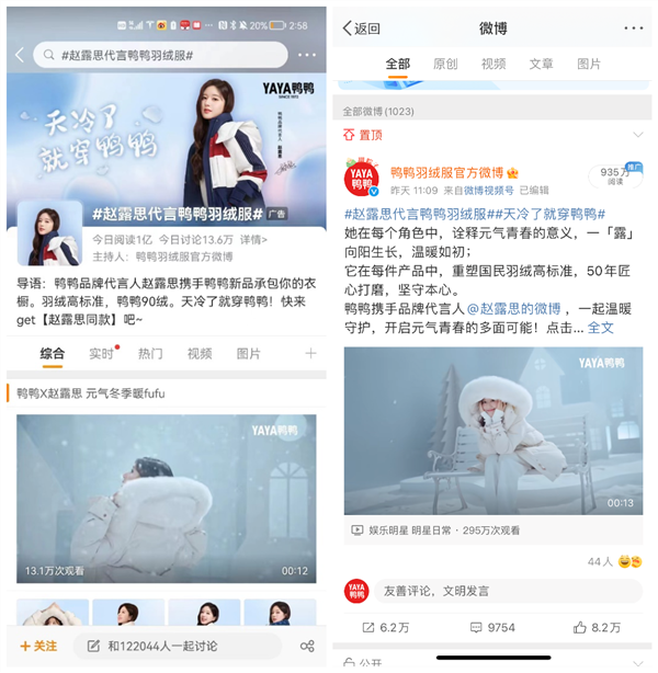 官宣當(dāng)天不到5小時(shí), #趙露思代言鴨鴨羽絨服#的話題閱讀量破億,官博微博閱讀量近1000萬(wàn)。雙方在立冬后第一天的強(qiáng)強(qiáng)聯(lián)合,為寒冷的冬天帶來(lái)了暖意。