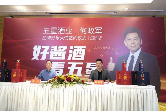 2023年4月27日,貴州五星酒業(yè)集團正式簽約國家一級演員何政軍(明星代言公司,)為品牌形象代言人,開啟品牌化運營新征程。五星酒業(yè)營銷總公司執(zhí)行總經(jīng)理劉有才,五星酒業(yè)品牌策劃管理中心總經(jīng)理李垚及相關負責人共同出席簽約儀式。