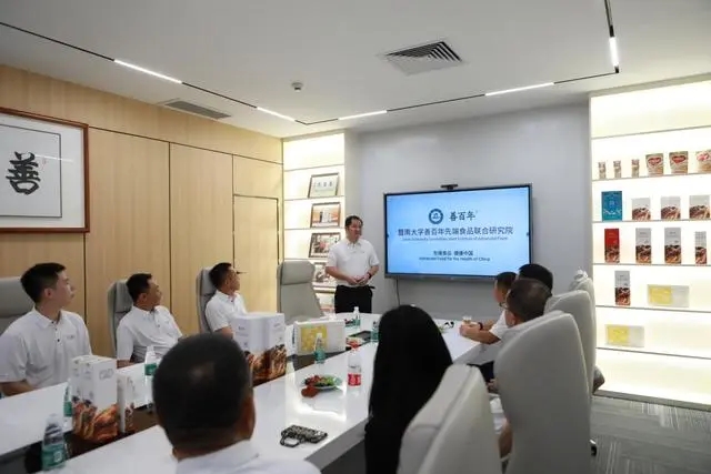 會(huì)議室內(nèi),善百年首席科學(xué)家,暨南大學(xué)理工學(xué)院副院長(zhǎng)汪勇教授,為侯勇詳細(xì)講解二酯油。