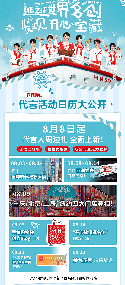 8 月 8 日,名創(chuàng)優(yōu)品正是官宣時代少年團(明星代言公司)為品牌全球代言人。在發(fā)布的官方代言大片中,時代少年團化身七位航海少年揚帆出海出發(fā)探尋世界各地的開心寶藏,從游歷奇妙的潮玩島嶼、到穿越變幻的季節(jié)之旅、甚至?xí)秤螘r尚的美妝都會,影片中的內(nèi)容也對應(yīng)了近年來名創(chuàng)優(yōu)品在海外的發(fā)展,如今全球 112 個國家和地區(qū)都有名創(chuàng)的身影,每一個角落都隱藏著閃閃發(fā)光的開心寶藏,名創(chuàng)優(yōu)品希望大家能夠在時代少年團的帶領(lǐng)下一逛世界名創(chuàng),發(fā)現(xiàn)開心寶藏。