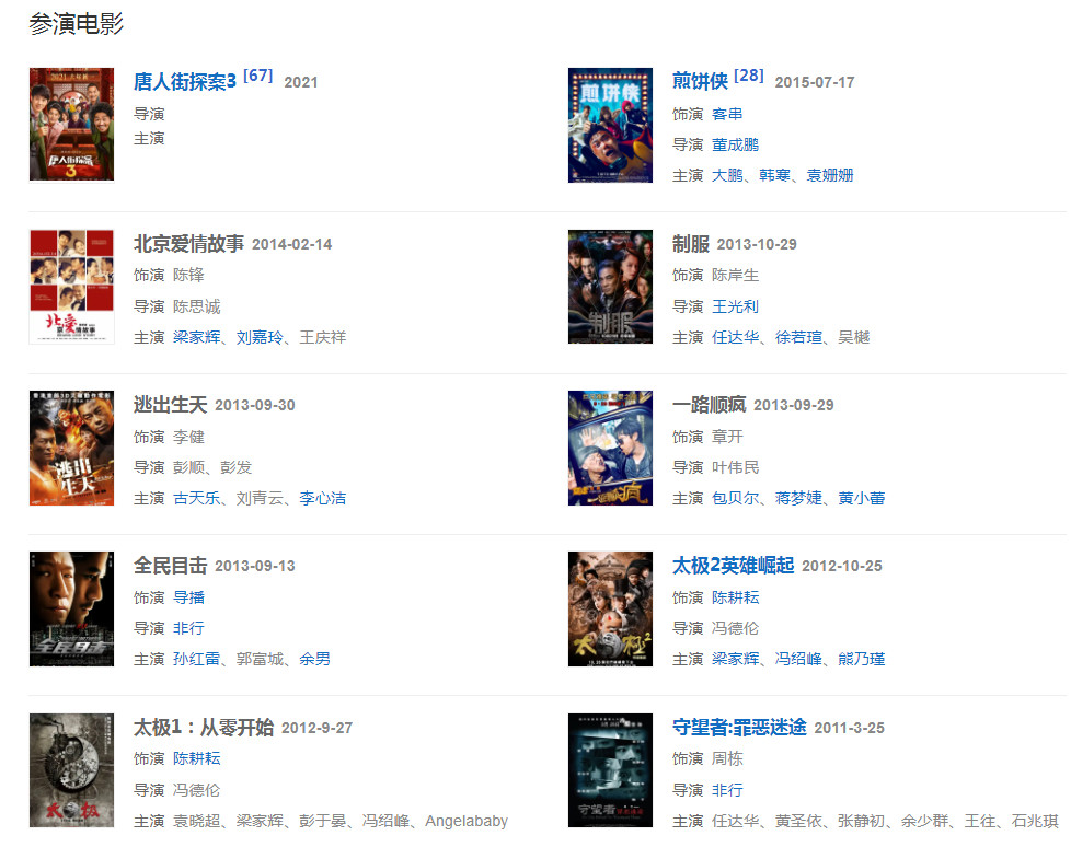 代表作品:北京愛情故事、唐人街探案系列、法官媽媽、春風(fēng)沉醉的夜晚、士兵突擊、戰(zhàn)神、遠(yuǎn)大前程